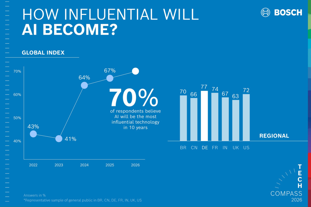 Průzkum Bosch Tech Compass, do něhož se zapojilo 11 000 lidí ze sedmi zemí světa, ukazuje, že většina lidí vnímá umělou inteligenci jako nejvlivnější a nejpozitivnější technologii nadcházejících let. Klíčovým zjištěním je, že nadšení pro AI celosvětově roste a 70 % respondentů ji považuje za klíčovou pro budoucnost.