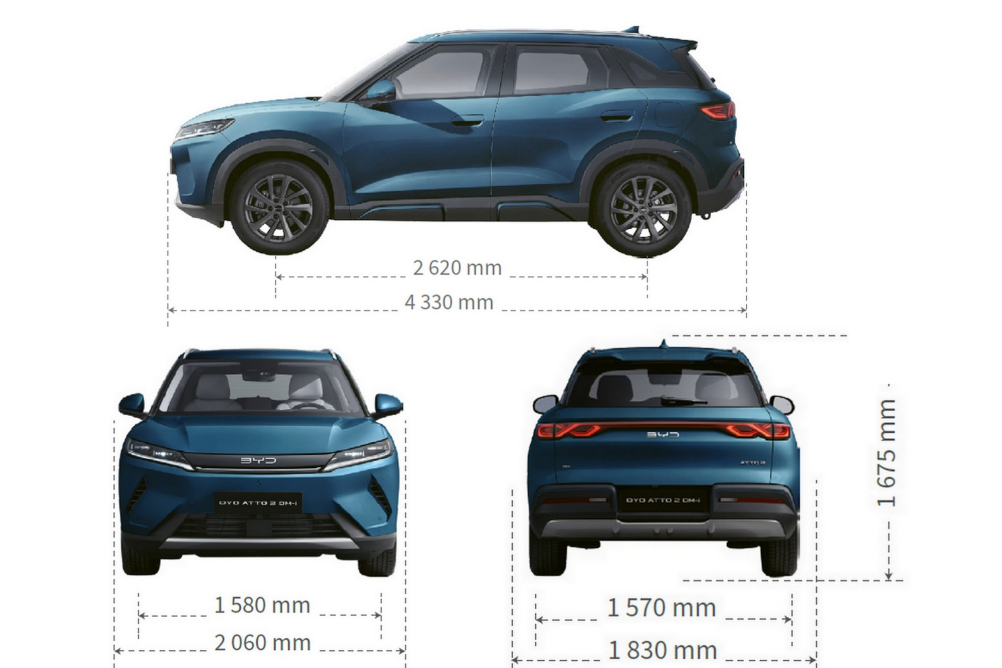 Prakticky přesně rok po uvedení čistě elektrického malého SUV Atto 2 nyní BYD přináší jeho verzi s pohonem Super Hybrid Dual Mode. BYD Atto 2 DM-i měří na délku 4330 mm (o 20 mm víc než plně elektrické Atto 2) a má relativně dlouhý rozvor náprav 2620 mm. Objem zavazadlového prostoru je 425 l resp. až 1335 l.