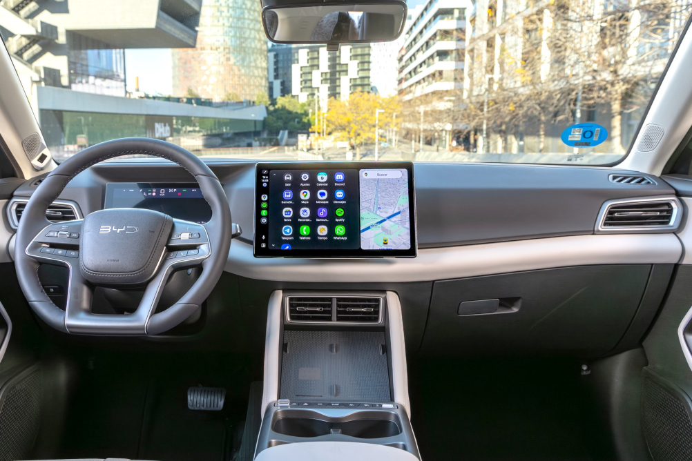 V interiéru je 8,8“ TFT digitální panel přístrojů a 12,8“ dotykový displej infotainmentu využívající nejnovější software BYD včetně vícedotykového ovládání klimatizace a ventilace. Mezi drobné změny oproti elektrické verzi Atto 2 patří přesunutí voliče jízdních režimů z centrální konzole na sloupek řízení. Interiér umožňuje hlasové ovládání s umělou inteligencí a možnost využití integrovaných služeb Google bez potřeby telefonu.