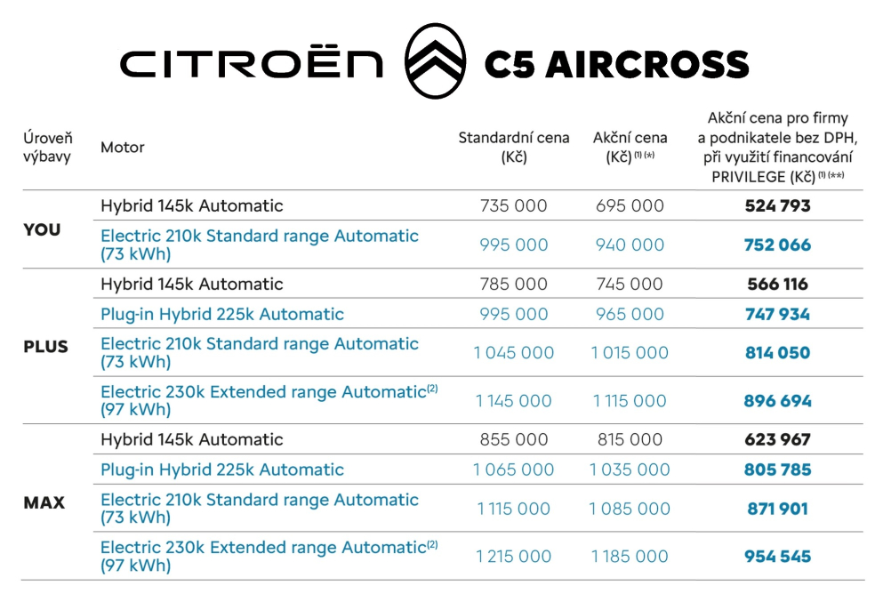 Značka Citroën upravila nabídku modelu C5 Aircross Plug-in Hybrid zvýšením výkonu na 165 kW (225 k), prodloužení dojezdu v čistě elektrickém režimu až na 113 km a možnost tažení přívěsu o hmotnosti až 1550 kg.