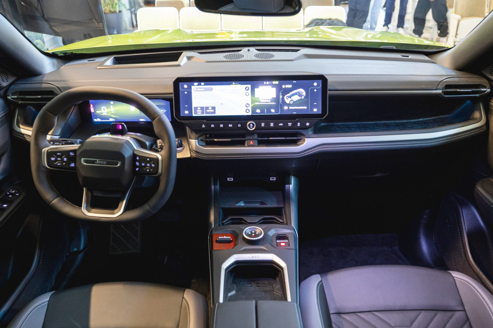 Přístrojová deska je potažena měkkou syntetickou kůží. Přístrojový panel tvoří displej 10“, který doplňuje head-up displej. Centrální displej infotainmentu má 16“.