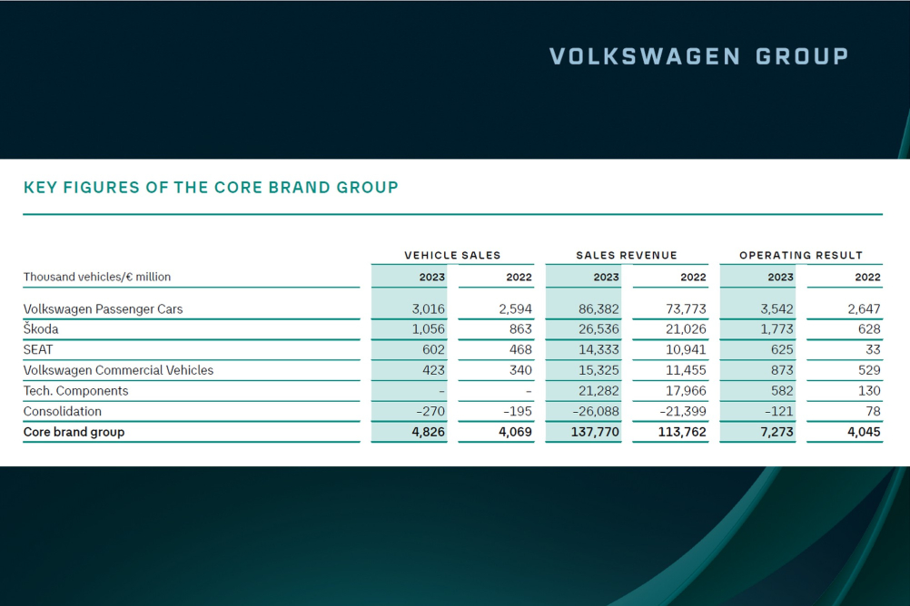 Provozní zisková marže pro hlavní skupinu Core, do níž patří i společnost Škoda Auto, loni vzrostla na 5,3 % z 3,6 % v roce 2022, přičemž společnost cílí na 8 %. Míra zisku u Progressive Brand Group (Audi, Lamborghini, Bentley, Ducati) klesla na 9 % z 12,3 % a u Brand Group Sport Luxury (Porsche) zůstala na úrovni předchozího roku 18,6 %. VW očekává, že rostoucí prodej vozidel pomůže kompenzovat ztráty v jeho softwarové jednotce Cariad, která za rok 2023 vykázala provozní ztrátu ve výši 2,4 miliardy eur. Provozní zisk v odnoži finančních služeb VW loni klesl o třetinu kvůli poklesu cen ojetých vozů.
