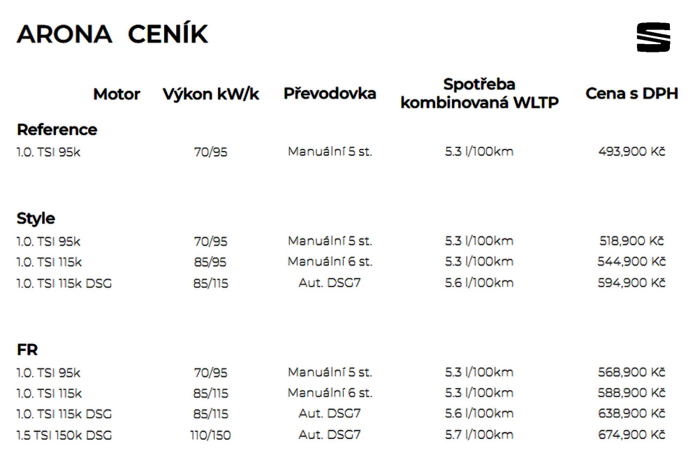 Městský crossover Seat Arona je k dispozici ve třech stupních výbavy v kombinaci s výhradně přeplňovanými zážehovými motory TSI ve variantách 1,0 TSI/70 kW (95 k) resp. 85 kW (115 k) a 1.5 TSI/110 kW (150 k). Nejvýkonnější motor se dodává výhradně s automatickou převodovkou DSG, která je pro výkonnější motor 1,.0 TSI za příplatek. Základní cena verze Arona Reference 1,0 TSI/70 kW (95 k) byla stanovena na 493 900 Kč. I pro model Arona jsou připraveny zvýhodněné akční pakety, díky nimž zákazníci ušetří až 31 700 Kč.