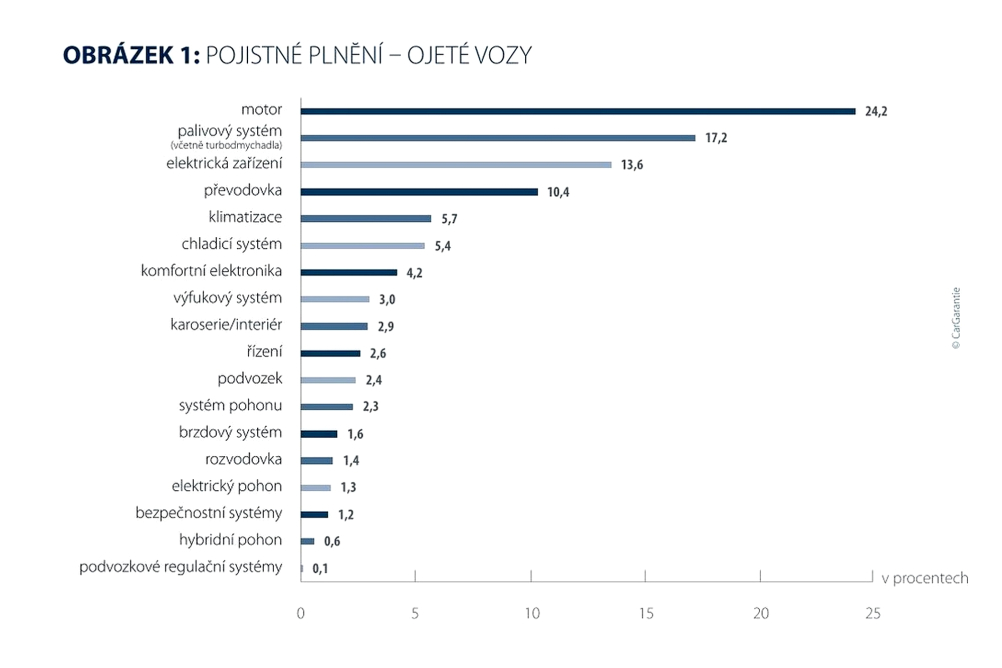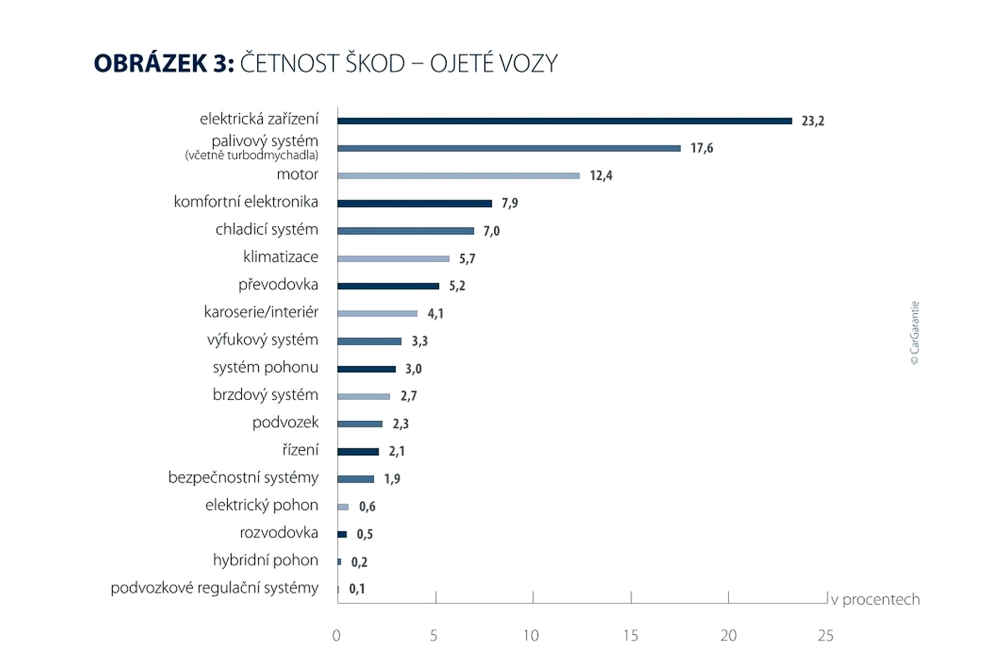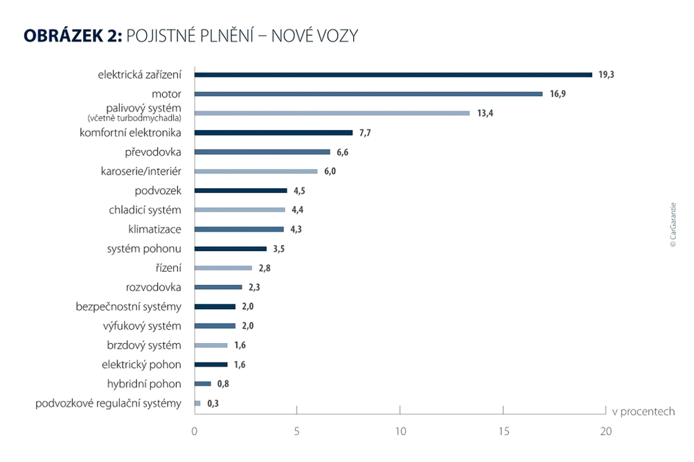Zvyšující se náchylnost elektrických systémů potvrzuje vývoj prognózovaný již v minulých letech: s rostoucí složitostí roste náročnost oprav i pravděpodobnost výskytu poruch. U ojetých vozidel zaujímá druhé místo palivový systém včetně turbodmychadla s 17,6 % (předchozí rok: 18,2 %), u nových vozidel komfortní elektronika s 15,2 % (předchozí rok: 14,9 %). Třetí místo u ojetých vozidel připadá motoru s 12,4 % (předchozí rok: 13,5 %), zatímco u nových vozidel palivový systém s 10,8 % (předchozí rok: 12,9 %).