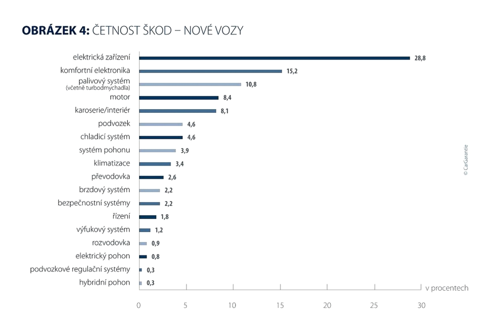 U nových vozidel je trend posledních let ještě výraznější: elektrická zařízení dosahují v roce 2025 podílu 19,3 % a poprvé předstihují motor. Motor klesá na 16,9 % (předchozí rok: 18,4 %) a zaujímá druhé místo, následovaný palivovým systémem s 13,4 % (předchozí rok: 15,5 %).