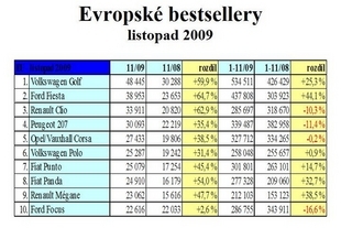 Nejprodávanější auta v Evropě během listopadu 2009
