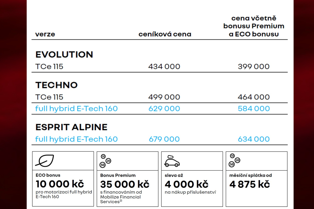 Základní verze TCe 115 evolution je dostupná již od 434 000 Kč se smluvní zárukou na 5 let resp. 100 000 km. E-Tech full hybrid 160 k je od 629 000 Kč. Základní výbava Evolution zahrnuje adaptivní tempomat, pokročilý systém sledování únavy řidiče, centrální 10,1“ displej, klimatizaci a zadní parkovací senzory. Střední výbava Techno přidává mj. multimediální systém openR link s integrovanými službami Google (Google Maps, Google Assistant a Google Play), nastavení multi-sense nebo automatické přepínání dálkových světel.