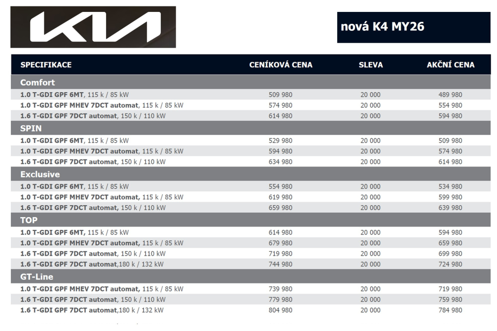 Automobilka Kia zveřejnila ceny a specifikace pro Českou republiku u nového rodinného hatchbacku K4 přicházejícího výhradně se zážehovými motory. Základní cena začíná na 489 980 Kč se sedmiletou záruku Kia. Objednávky jsou již spuštěny a první vozy budou zákazníkům v České republice doručeny počátkem ledna 2026.