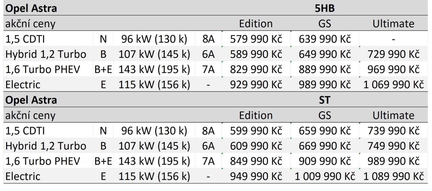 Nejnovější Astra je moderní, velmi zajímavé auto s nadstandardním komfortem i výkony pro ty, kteří stále ještě nepodlehli módě crossoverů a SUV. Nejlevnější verzí je překvapivě turbodiesel s akční cenou začínající na 579 990 Kč za hatchback a 599 990 Kč za kombi. Čistě elektricky poháněné verze stojí od 929 990 Kč (hatchback) resp. od 949 990 Kč (Sports Tourer).