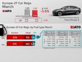 Registrace nových osobních automobilů během března v Evropě už sedmý měsíc za sebou poklesly. Za první čtvrtletí dosahuje meziroční pokles 3,2 %. Počet nově registrovaných elektrifikovaných vozidel (tj. s akumulátory, plug-in hybridních a hybridních) dosáhl rekordních 125 400 kusů.