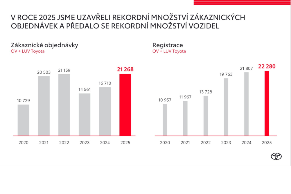 „Tržní prostředí v České republice se postupně přibližuje předcovidovým úrovním, přičemž celkový trh osobních a lehkých užitkových vozů v roce 2025 meziročně rostl. Toyota na tento vývoj reagovala rekordním počtem zákaznických objednávek a registrací, kdy v roce 2025 dosáhla historicky nejvyšších hodnot v obou ukazatelích. K dosaženým výsledkům loňského roku přispělo uvedení nových modelů, zlepšení dostupnosti vozů a silná pozice značky ve flotilovém segmentu. Růst podpořila také služba Kinto One a program Toyota Professional zaměřený na firemní zákazníky,“ uvedl Martin Peleška.