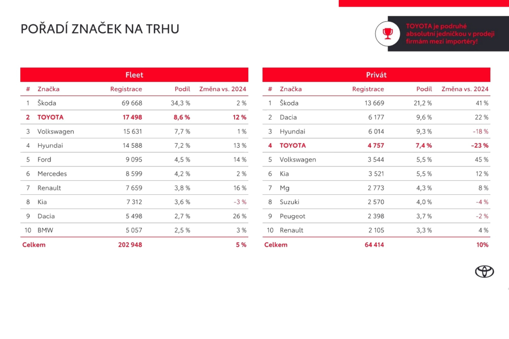 V České republice má značka Toyota za sebou další rekordní rok. Registrace nových osobních a lehkých užitkových vozů zvýšila o 2,2 % na 22 280 aut, což je nejvíc v historii. Dosáhla celkově druhé místo na trhu a tržní podíl 8,3 %. Už druhý rok v řadě jí patří první místo mezi importéry. Kromě registrací zaznamenala Toyota rekordní rok i v počtu nově uzavřených smluv, které s počtem 21 268 přesáhly i dosud rekordní rok 2022.