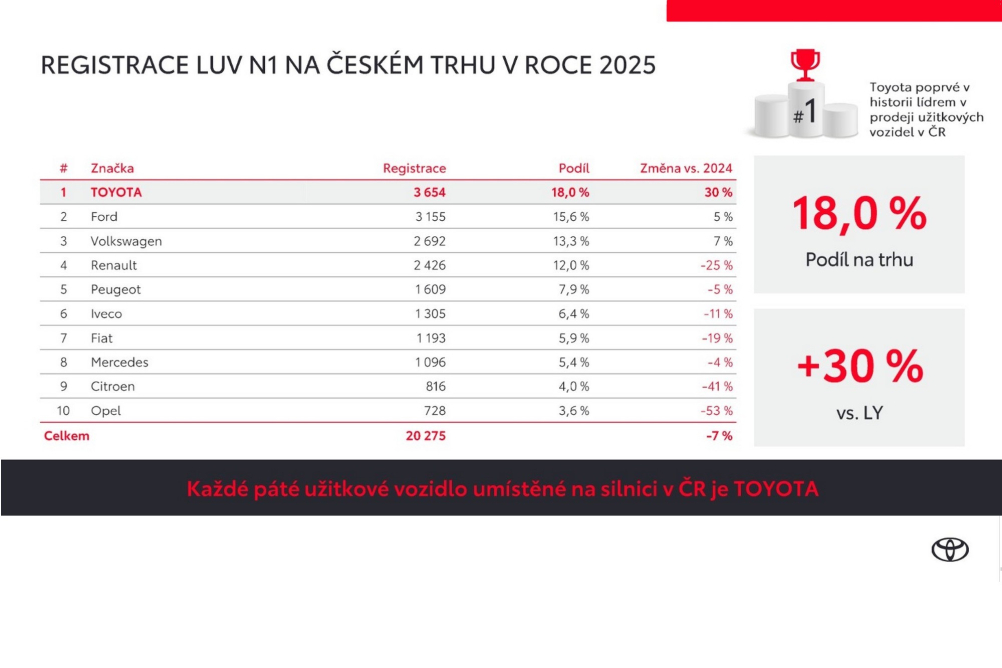 Výrazný milník zaznamenala za rok 2025 Toyota v kategorii lehkých užitkových vozů. S prodejem 3654 nových vozidel jí patří celkové prvenství na trhu LUV s podílem 18,0 %. Meziročně prodala o 30 % užitkových vozů víc. Přitom měla omezené alokace pick-upu Hilux. Nejúspěšnější byl největší model ProAce Max.