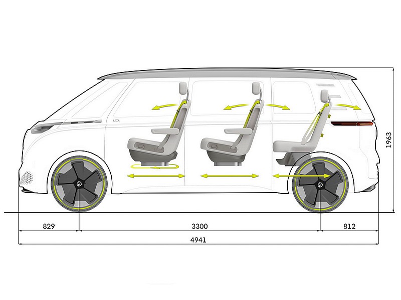 ID Buzz je 4941 mm dlouhý, tedy o 344 mm delší než koncept Budd-e. Nová platforma VW MED, původně představená u hatchbacku ID má dlouhý rozvor náprav 3300 mm a poměrně krátké převisy vpředu i vzadu.